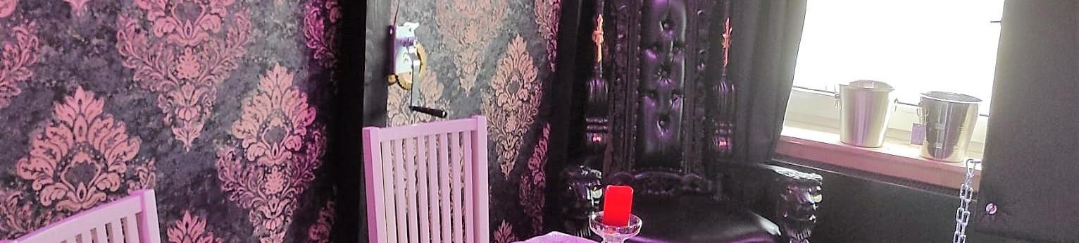 Playroom; mit Thron, Andreaskreuz, Sklavenstuhl, Singer und Handseilwinde. Der Raum ist mit Balken durchzogen, an denen etliche Fixierpunkte sind daher ist ein Bondage kein Problem.