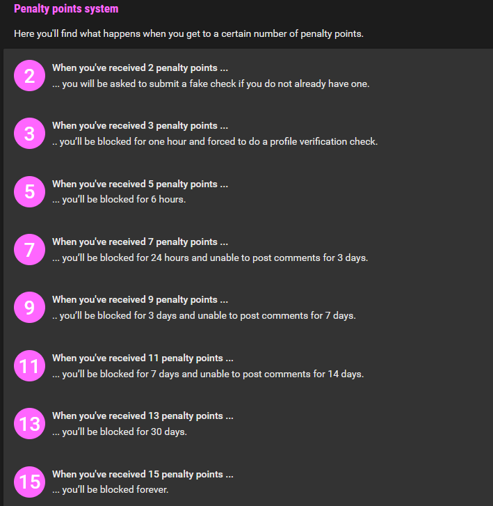 CaraVirt Posted January 7 Thank you for your perspective @VDK and the description of your impression regarding ‘disappeared’/blocked profiles. I can understand that such an impression can arise. But I would appreciate if people thought a little ‘outside the box’. For example, it could be a system error if a lot of long-standing profiles are suddenly blocked. We had a system problem with certain email addresses last year, for example, which resulted in some members (with such an address) being ‘accidentally’ banned. After we received the first reports, this was immediately checked by the technical department, the error was corrected and all affected profiles were released again and refunded for the damage. What's more, you don't notice all the misbehaviour that is sanctioned in the background. A long-standing membership, loads of pictures/videos/etc. and a friendly individual exchange does not automatically mean that such a member will behave in accordance with the rules in all areas. The sanctions triggered by warnings depend on the number of warning points ‘accumulated’ to date. The more warning points someone has, the more drastic the sanction. As soon as someone has ‘accumulated’ 15 warning points, the profile is blocked. Here is an overview of the penalty levels: As most warning points expire after some time, it is not so common that members ‘shoot themselves in the foot’ through constant misbehaviour. But it does happen - even (and especially) with long-standing members. There are also some rule ***s that result in an immediate profile ban (e.g. offering financial services, ‘real’ incest or *** sex activity). I'm not saying that the profiles you have in mind have misbehaved in this way. I'm just trying to explain the possible reasons for profile bans - which are incomprehensible from a personal point of view. We cannot and must not talk about such activities in public. For data protection reasons and to protect the privacy of our members. Therefore, I cannot go into details here. But any affected member can contact support and ask for the reasons and details. Even if the profile is blocked - please simply send an email to [email protected]. Best regards Carmen, Community Team
